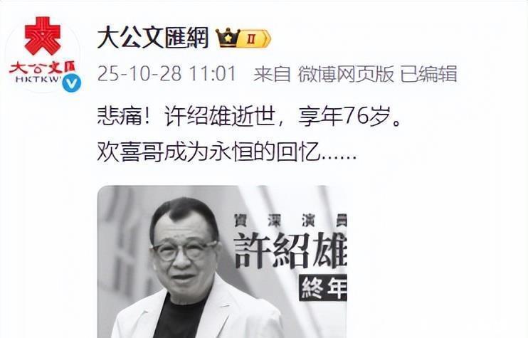 没想到,仅仅六天时间,竟然有四位明星先后去世了。到了10月27号那天,香港的演员许绍雄突然被传出“病危住院”的消息。