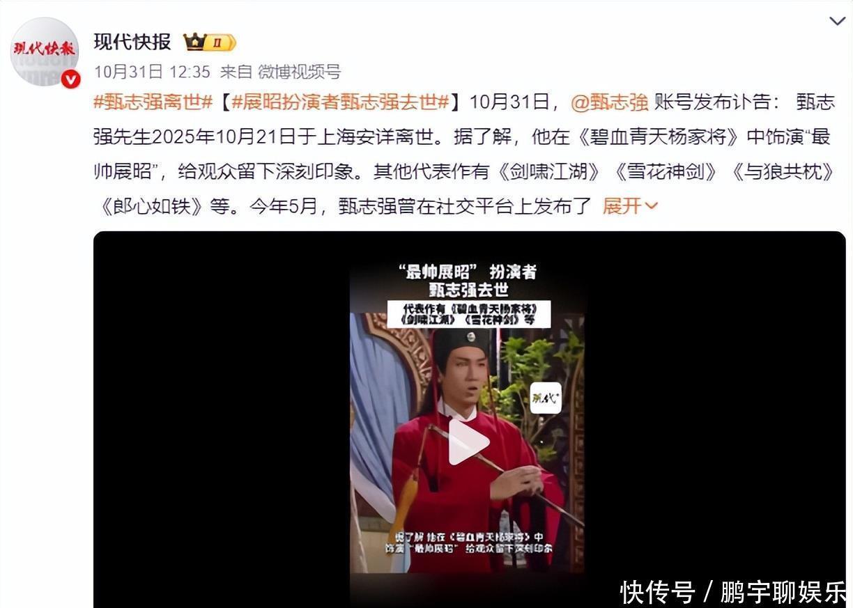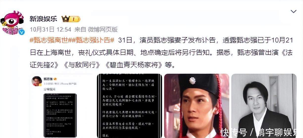 10月29日,坣娜的生命就此停驻在了这一天,再也没有续写。不过,才过了一天,10月31日一大早,又传来令人心碎的消息,“最帅展昭”甄志强先生也离开了,享年58岁。