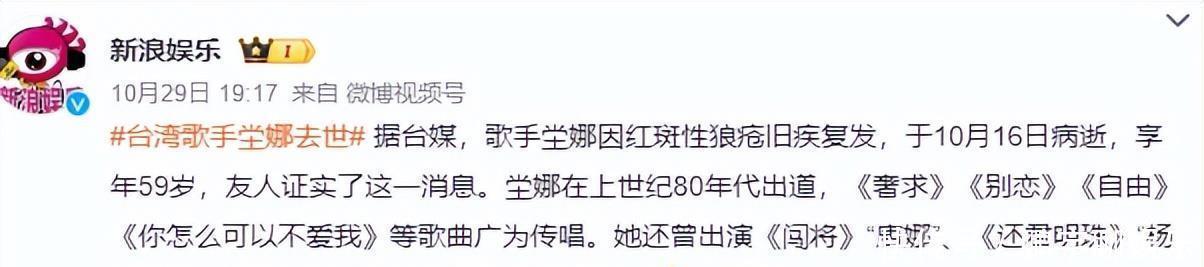 没想到,许绍雄一走,才一天的功夫,台湾59岁的歌手坣娜就因为“红斑性狼疮”的旧病复发,不幸离开了人世。