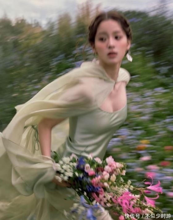 身着薄荷绿刺绣纱裙,搭配自然风编发造型,赤脚奔跑于花径之间。