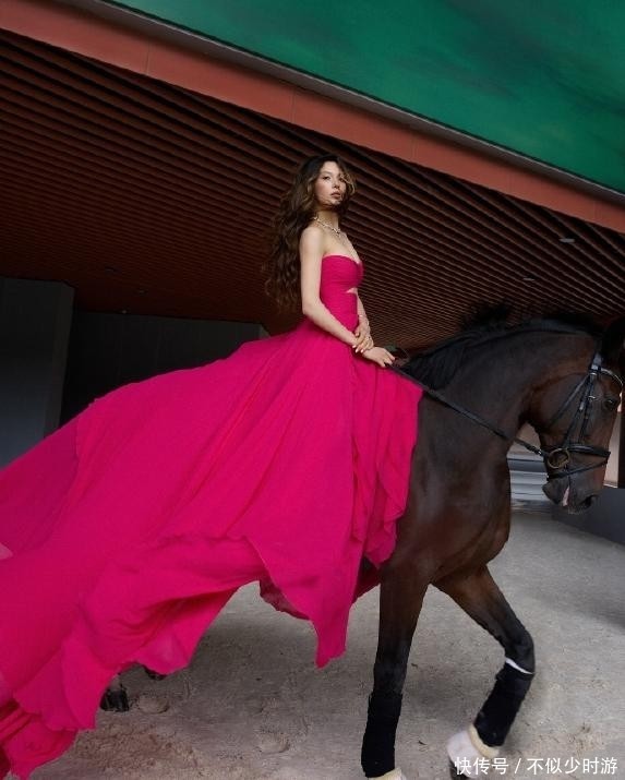 她身穿一袭玫红色长裙,骑乘骏马缓缓步入红毯中央。